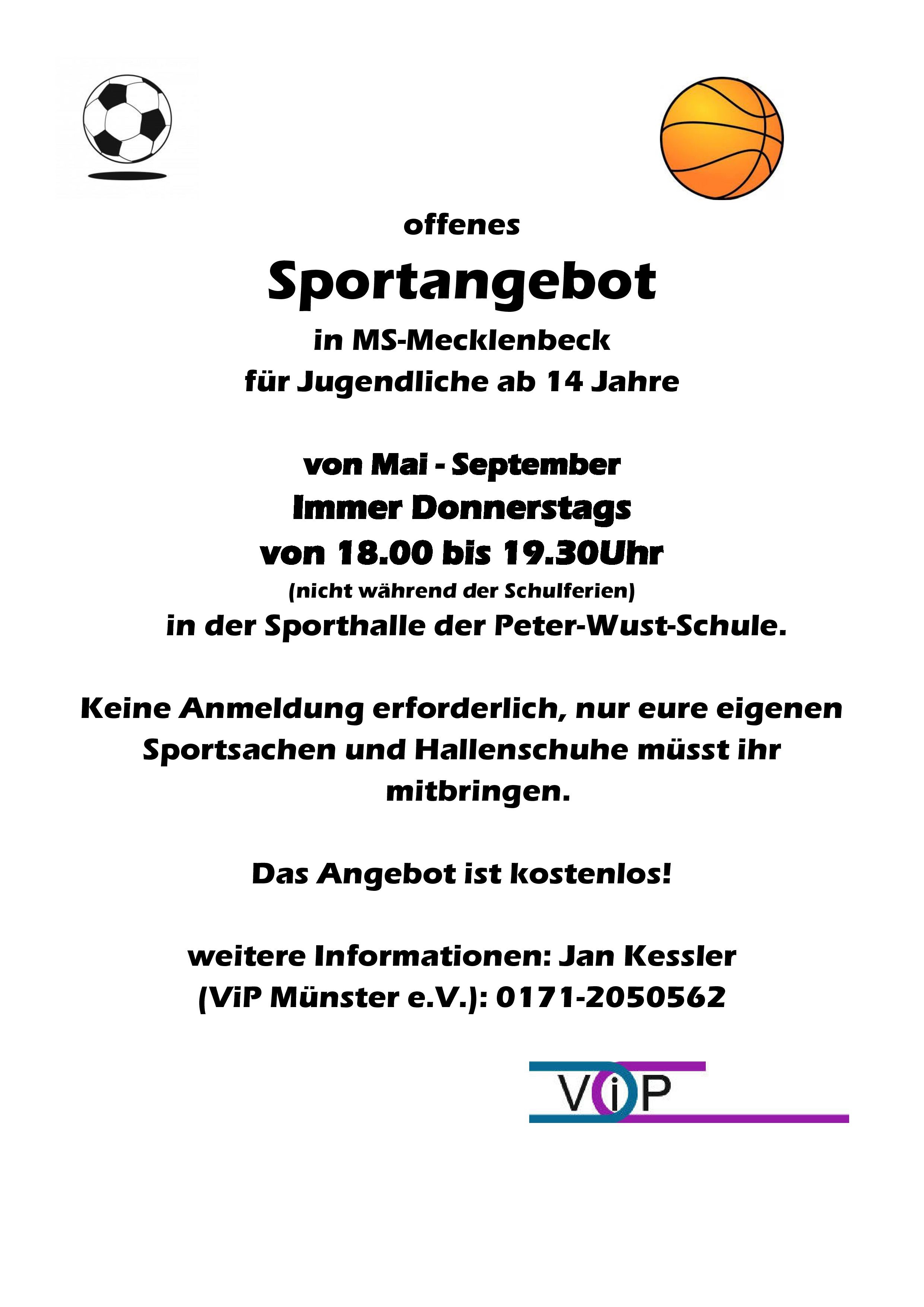 Von Mai bis September bietet der ViP donnerstags von 18:00 - 19:30 Uhr ein kostenloses Sportangebot in der Halle der Peter-Wust-Schule an.